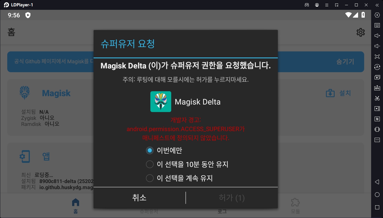 - Magisk 글씨 오른쪽에 있는 설치를 클릭하고 나타나는 화면에서 파일 엑세스 허용을 클릭합니다.