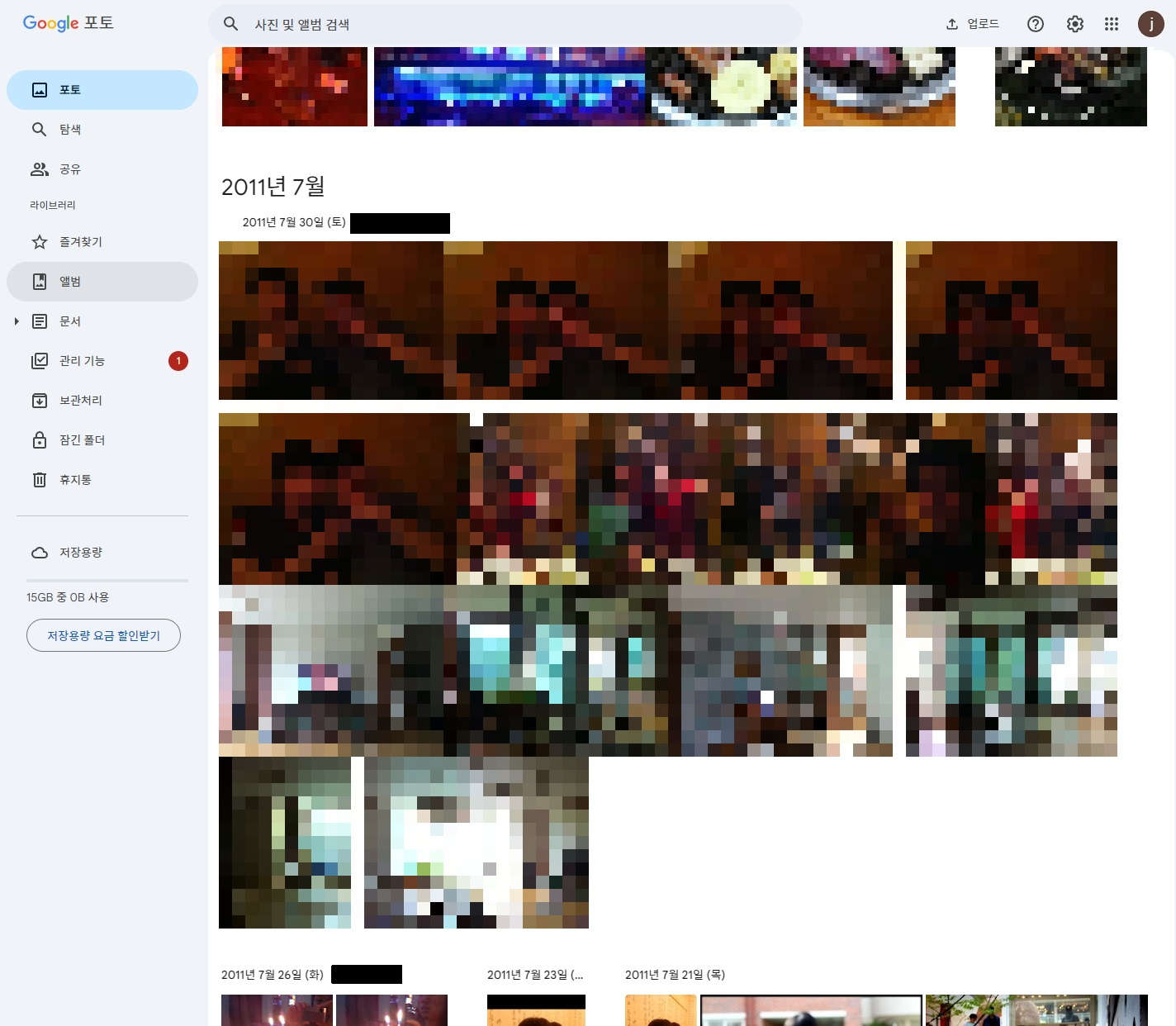 - 구글 포토에서 확인할 수 있듯이 사진들은 저장되었지만 "저장용량"을 보시면 0B 사용 중인 것으로 나오는 것을 볼 수 있습니다.