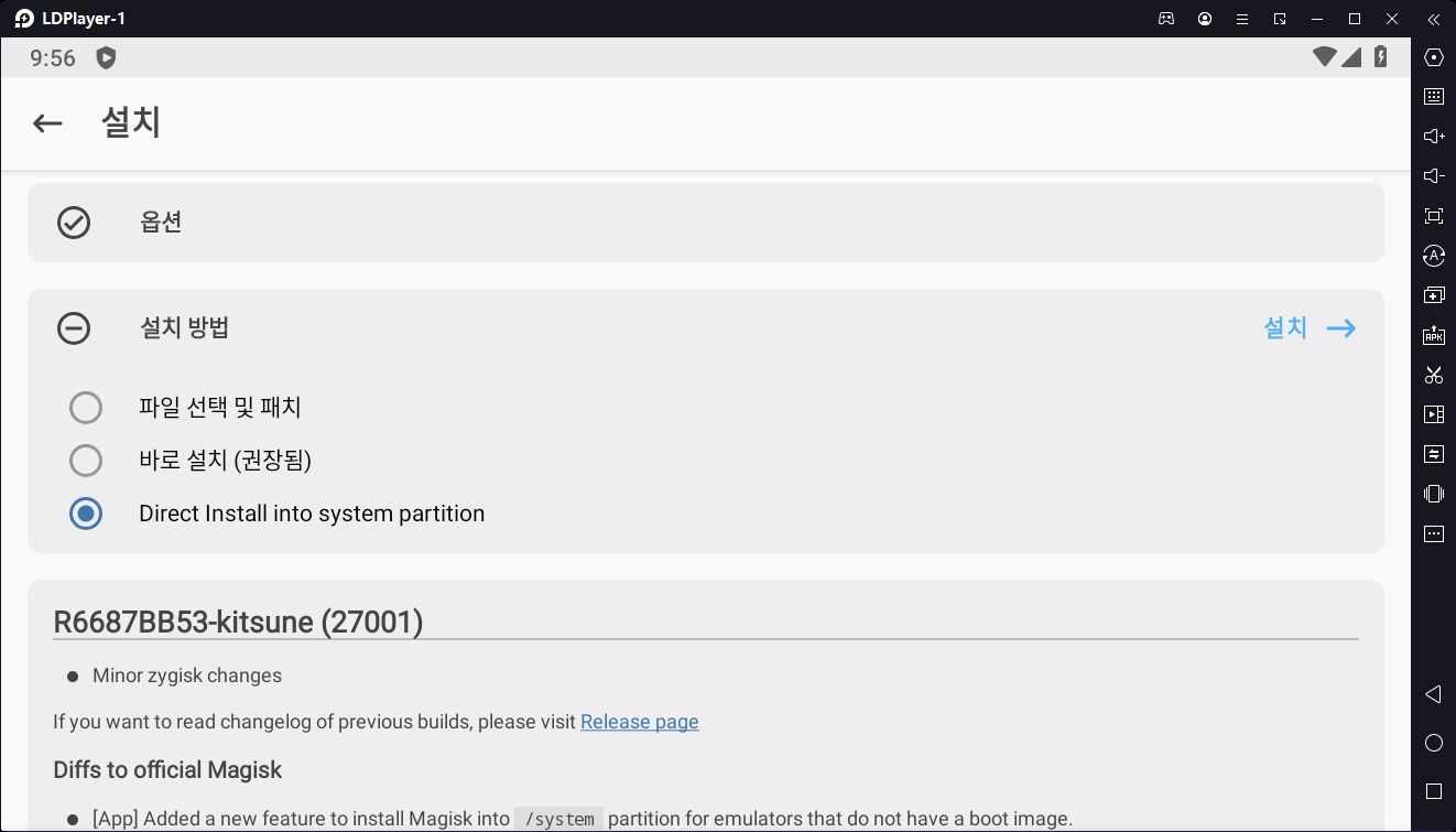 - 설치 방법 항목에서 "Direct Install into system partition" 선택 후 설치 진행합니다.
