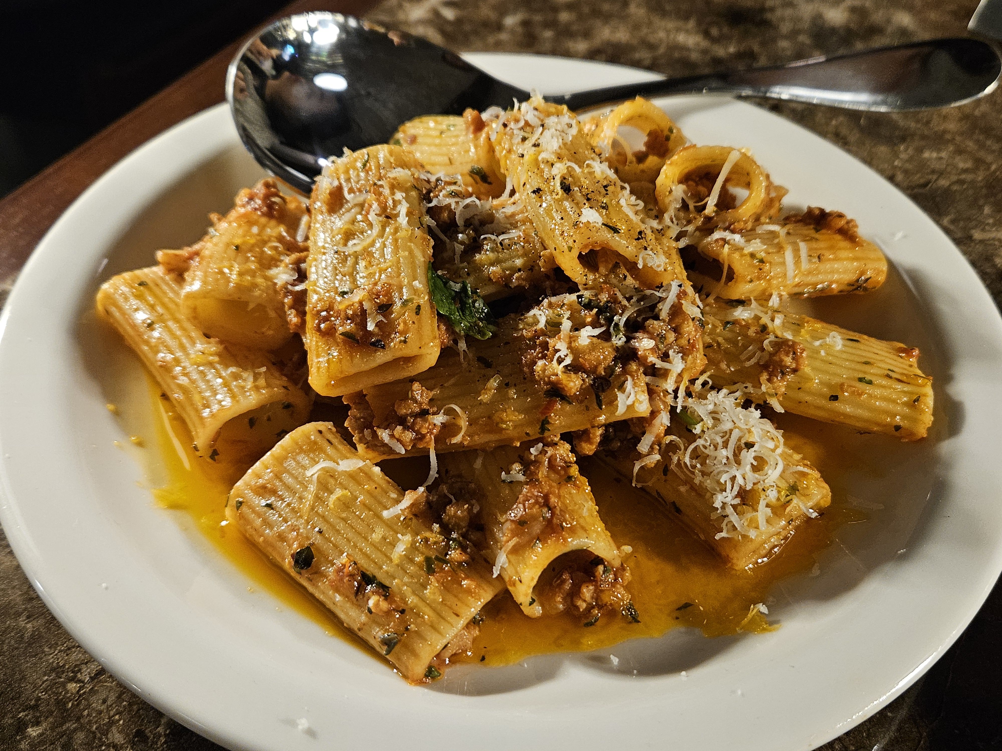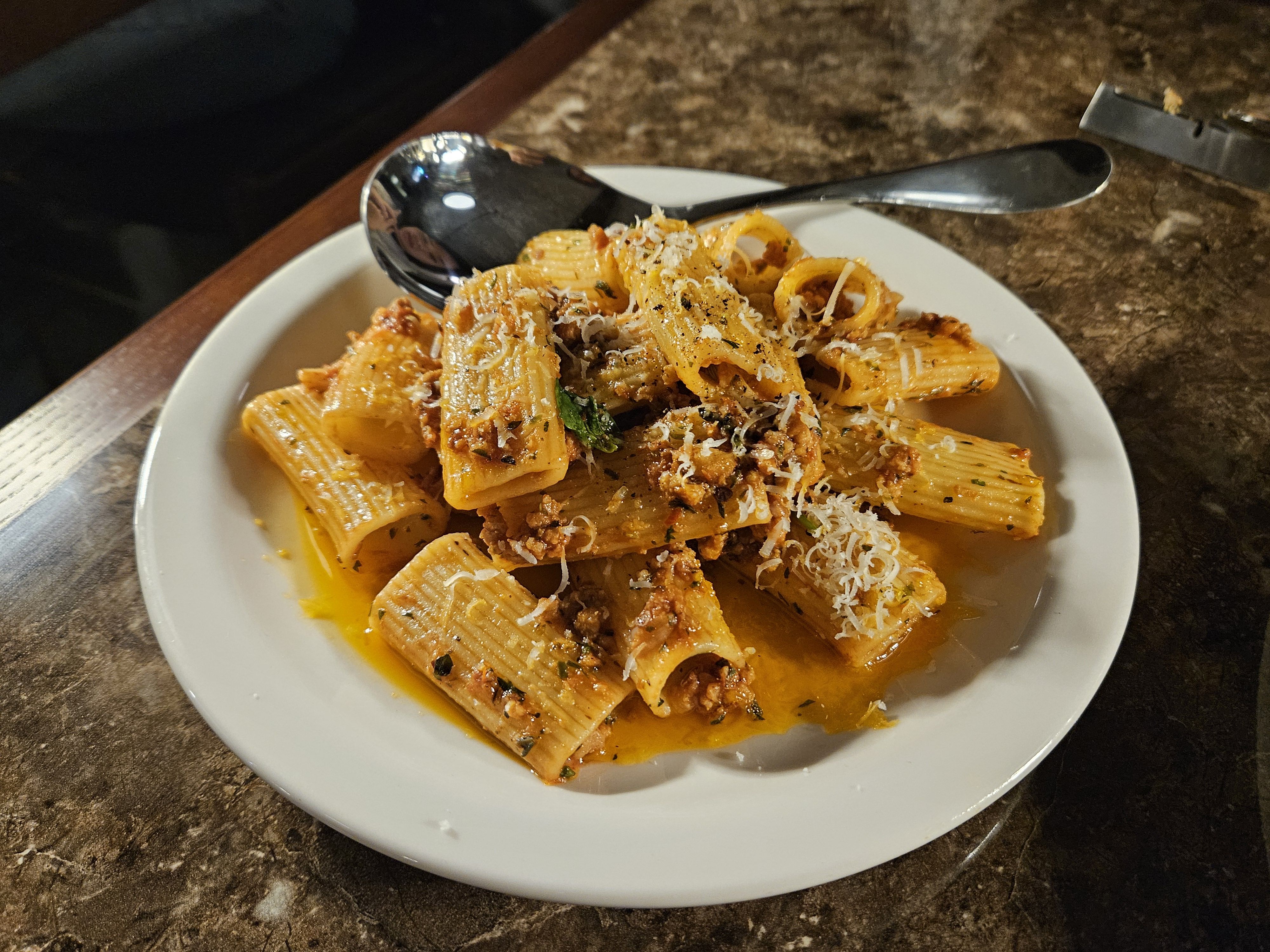 파스타 lover인 여자친구를 위해 라구 파스타도 주문했어요. 진한 소스와 알덴테로 익힌 파스타의 조화가 일품이었어요. 파스타 위에 뿌려진 파마산 치즈가 풍미를 한층 더해줬죠.