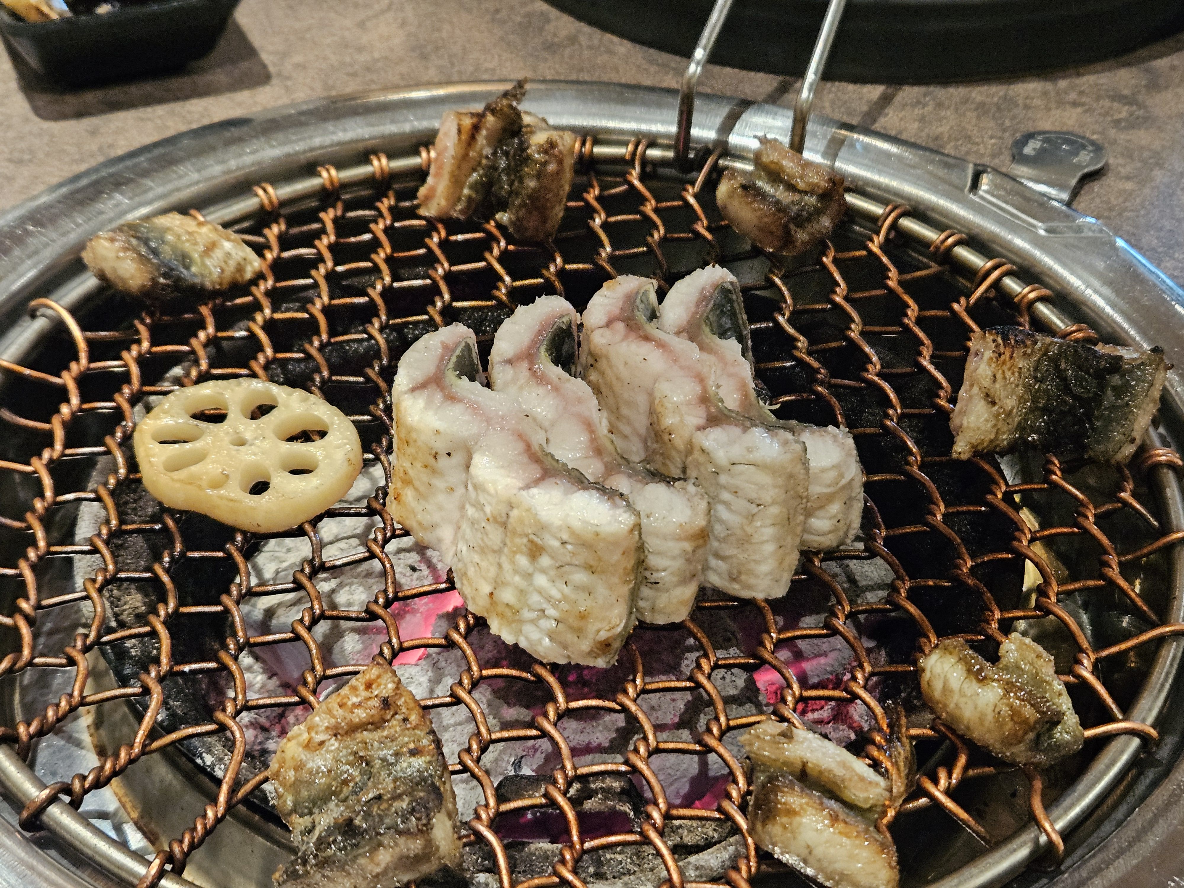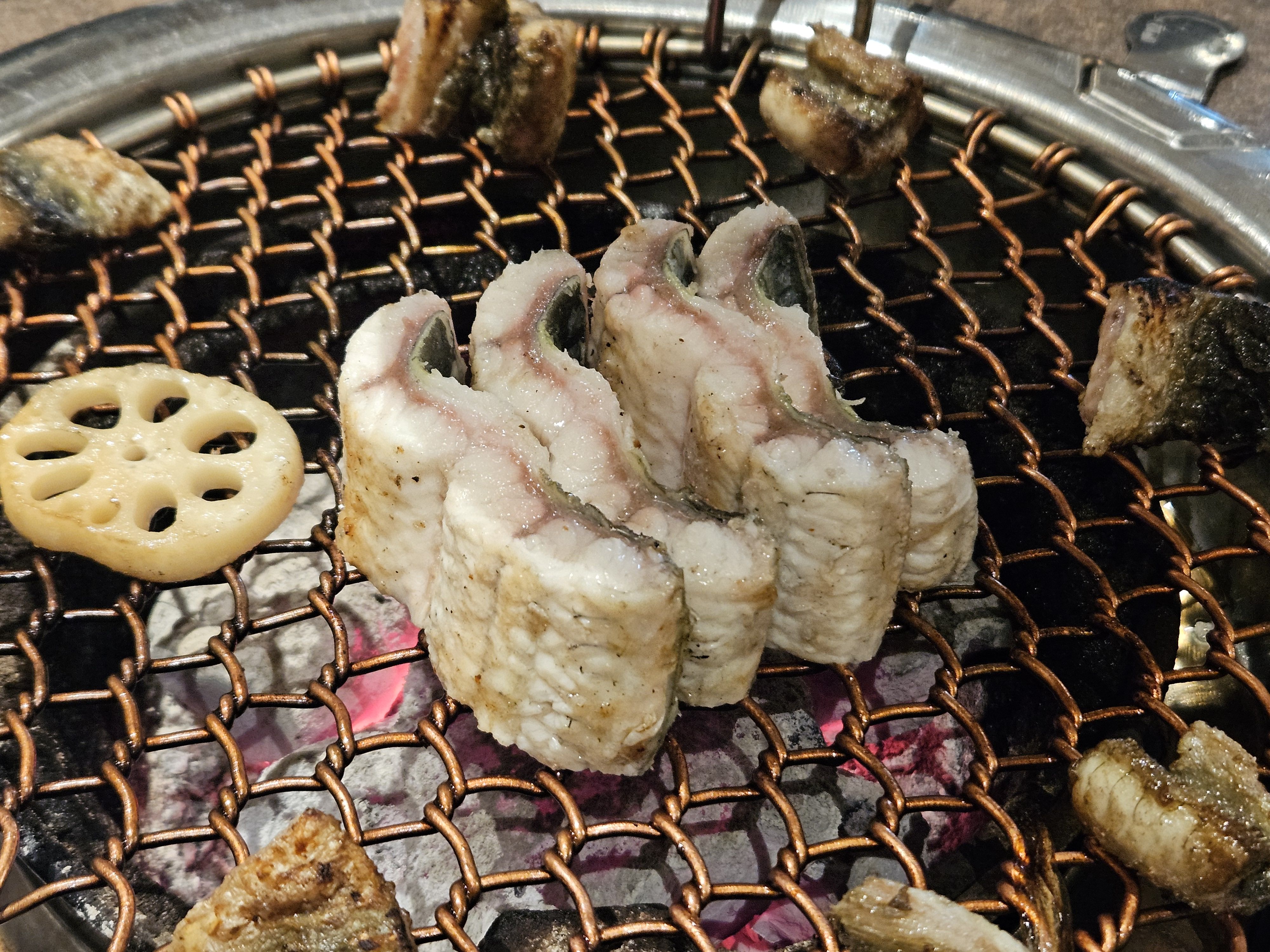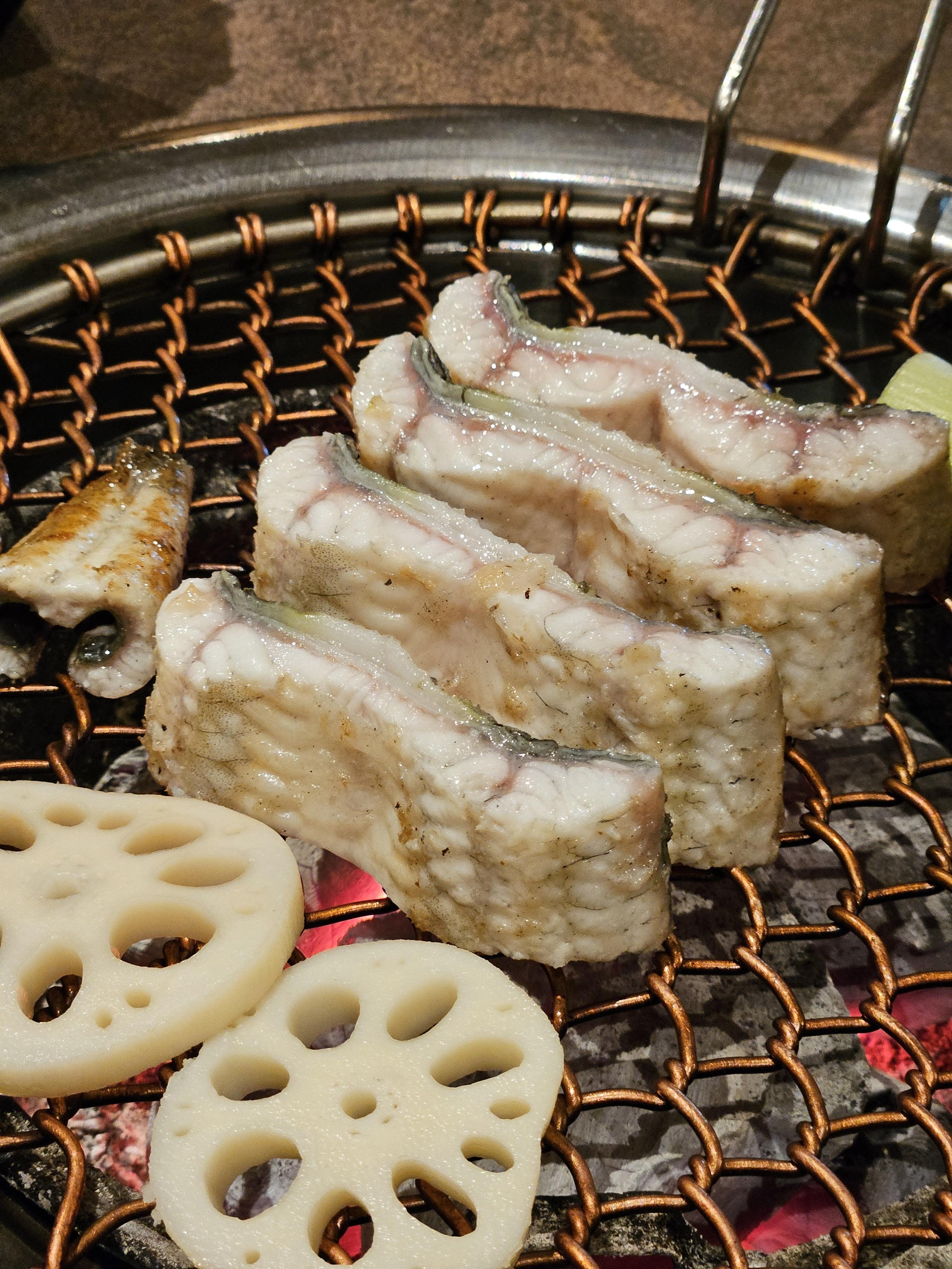 장어가 나왔을 때 그 비주얼에 또 한 번 놀랐어요! 정말 '웅장'하다는 말이 딱 맞더라고요. 굵고 큼직한 장어들이 숯불에 구워져 나와서 식욕을 자극했답니다.