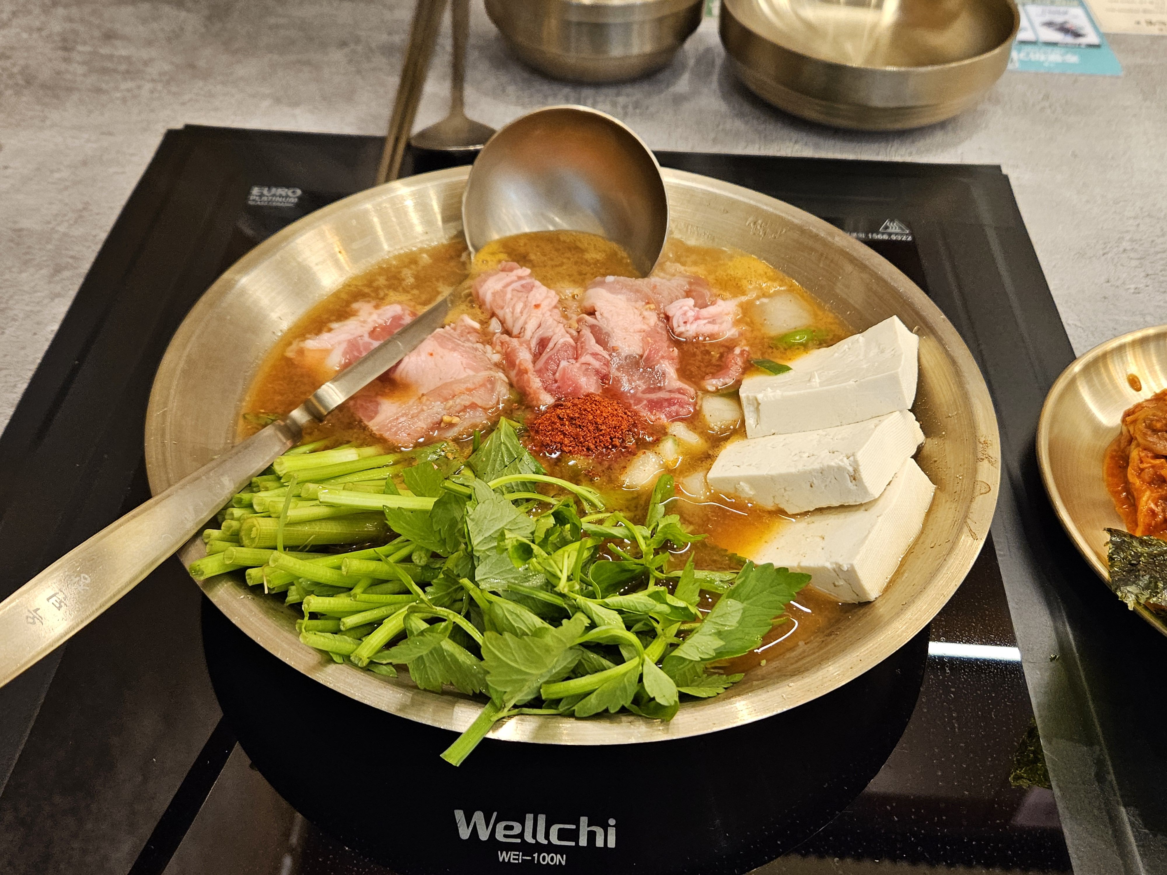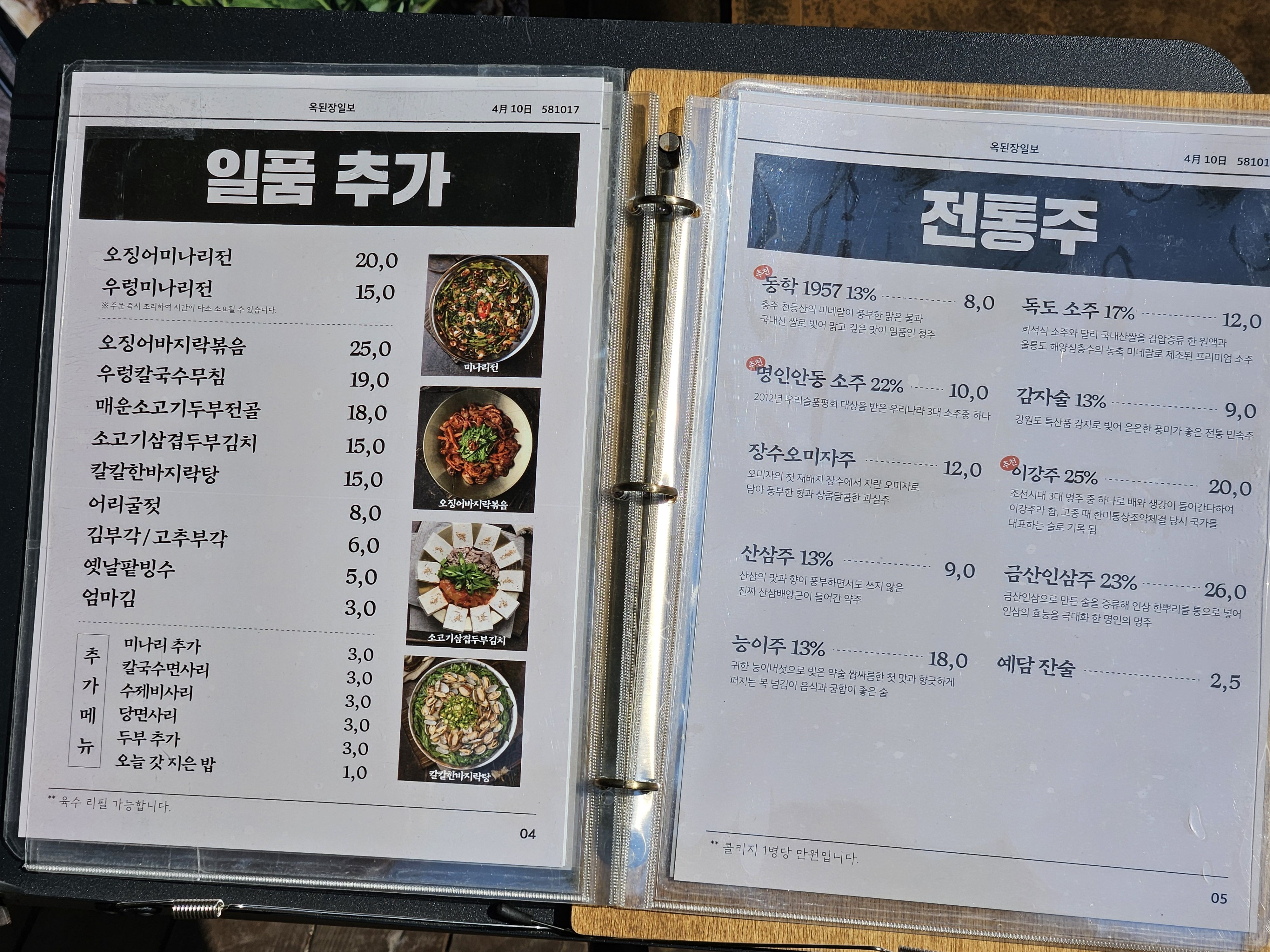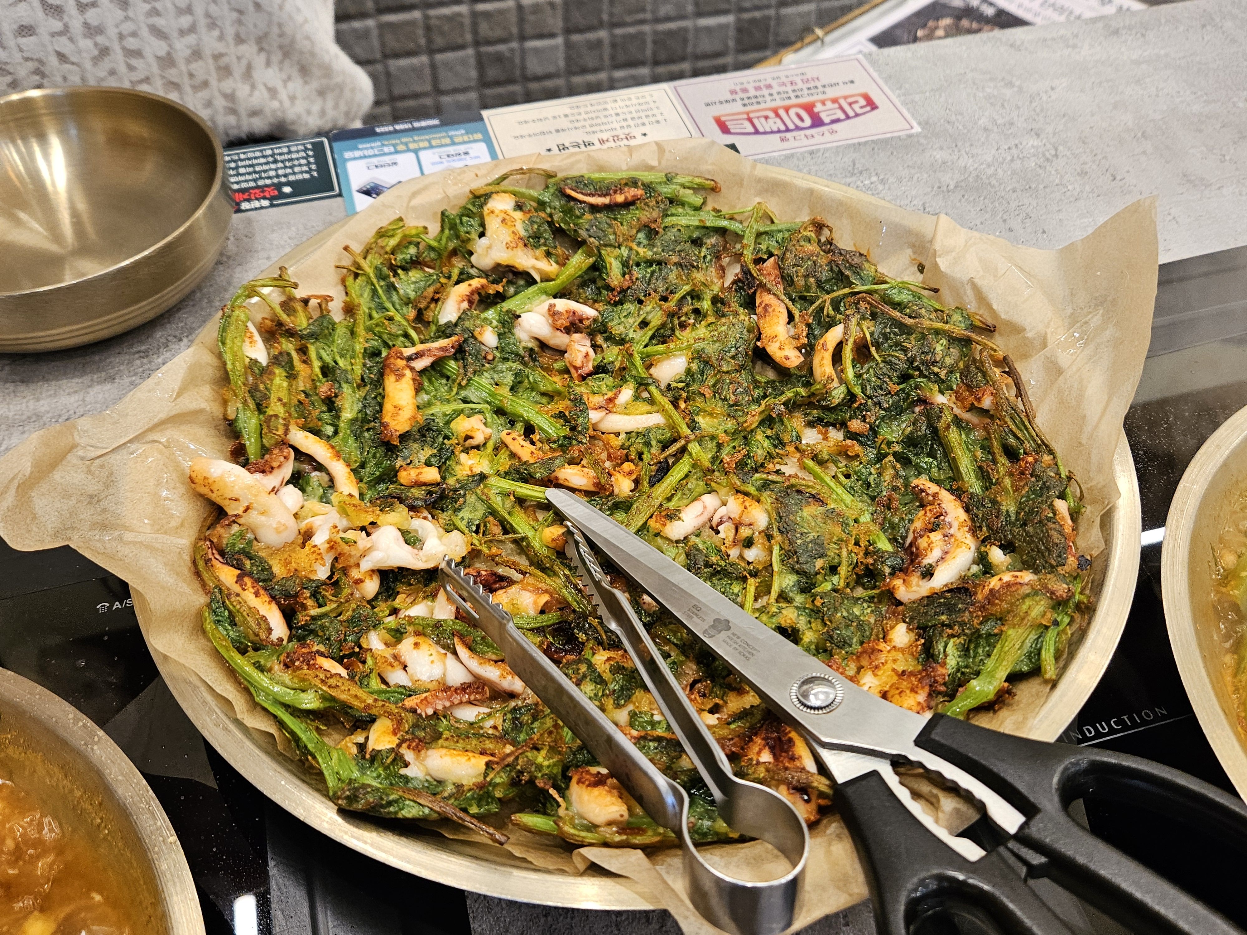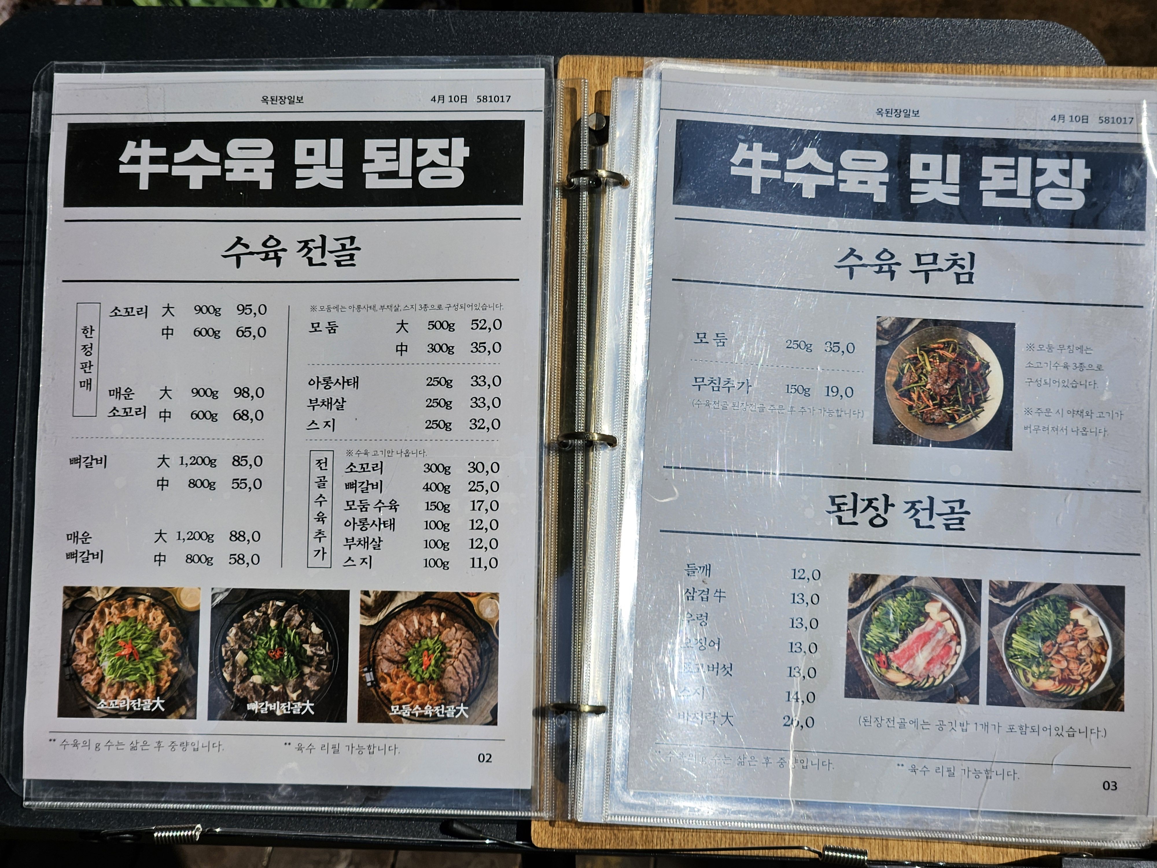 저희가 주문한 메뉴는 오징어 미나리전, 우렁된장전골, 그리고 표고버섯된장전골이었어요. 🥘