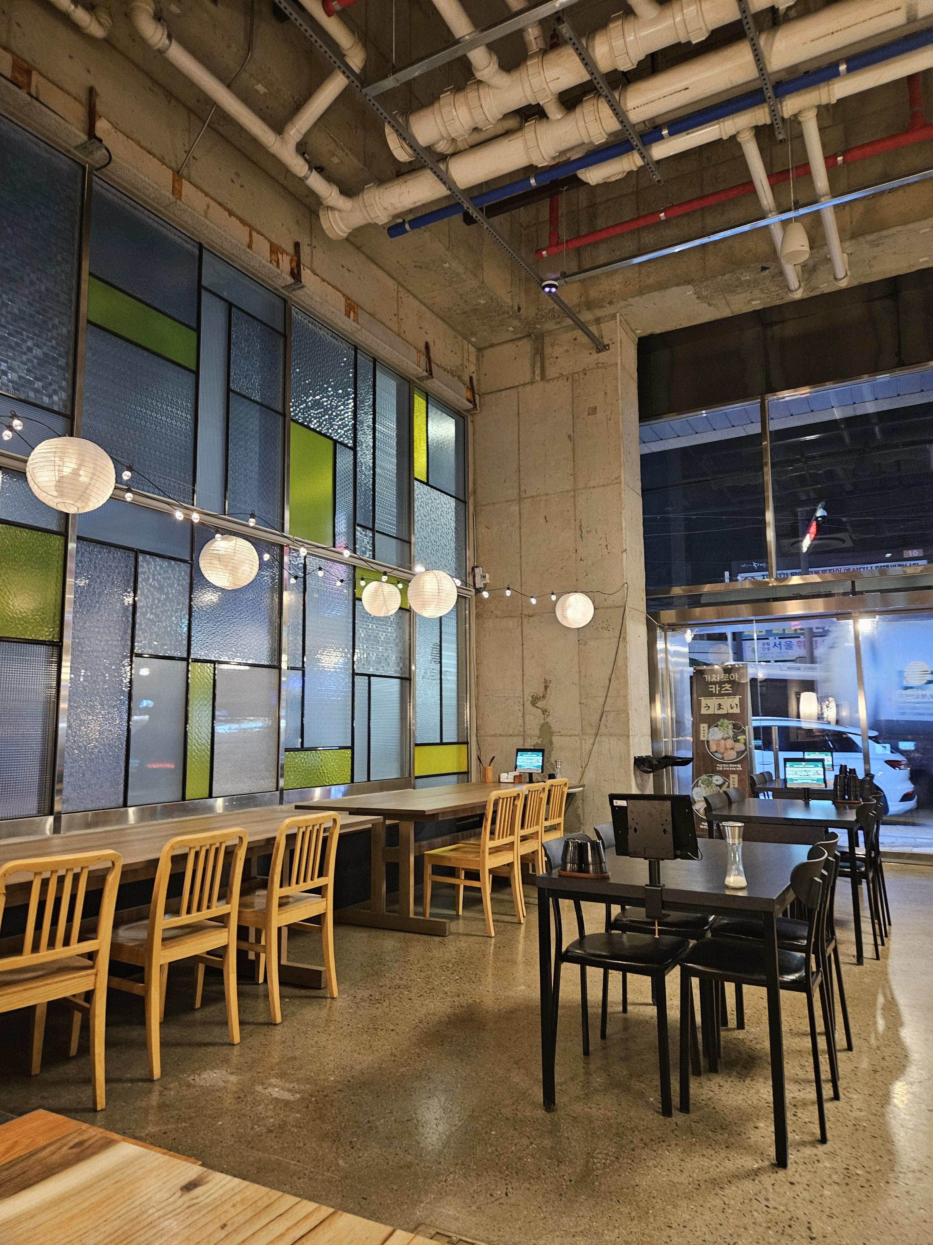 마치 대형 카페에 온 것 같은 느낌이었죠. 테이블 간격도 넓어서 편안하게 식사할 수 있어요. 은은한 조명과 세련된 인테리어가 눈에 띄었어요. 데이트하기에도 딱 좋은 분위기랍니다!