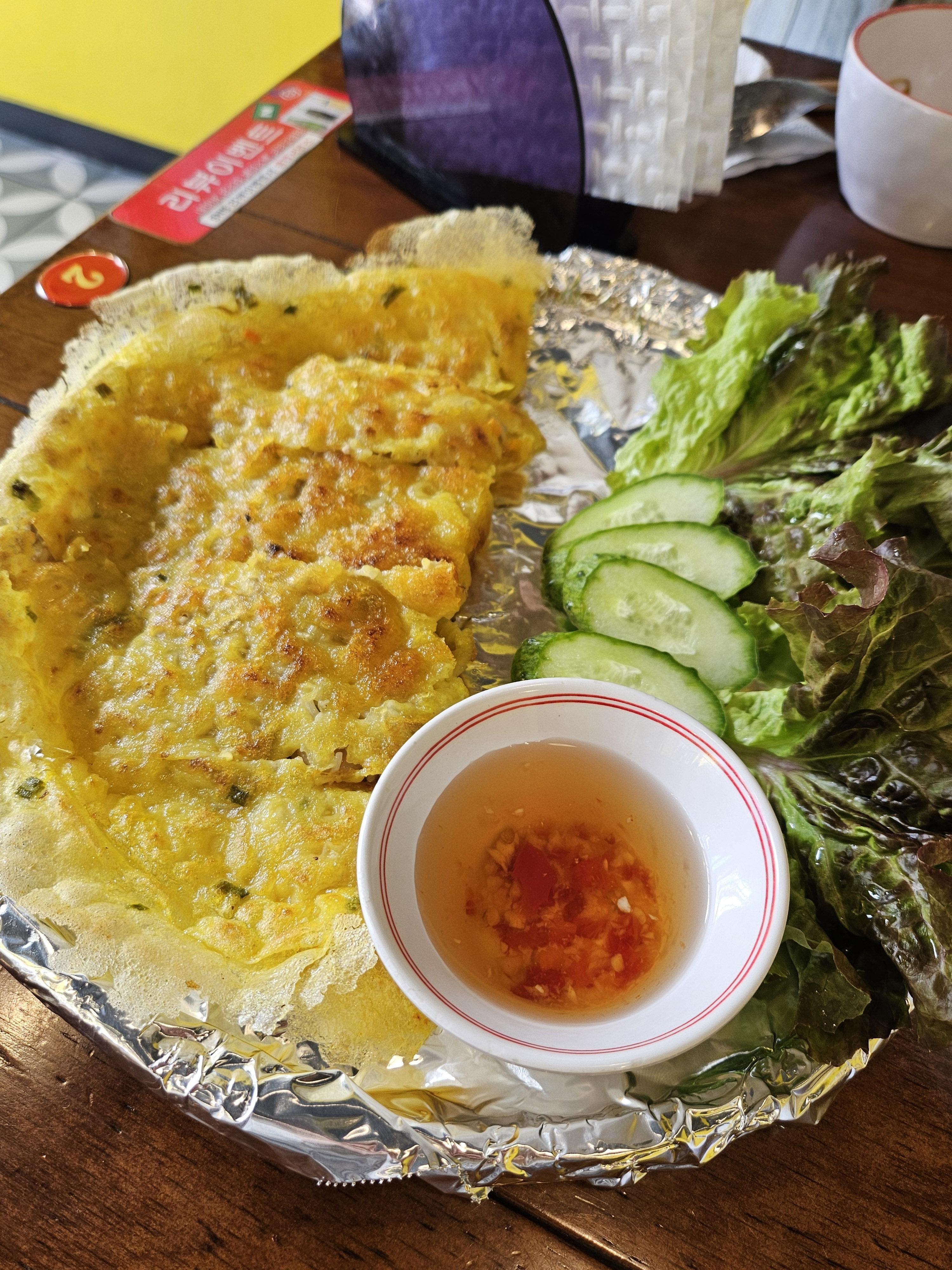 반쎄오는 베트남식 부추 전인데요. 바삭바삭한 외피에 신선한 야채와 새우가 들어있어요. 소스에 찍어 먹으면 정말 별미예요!