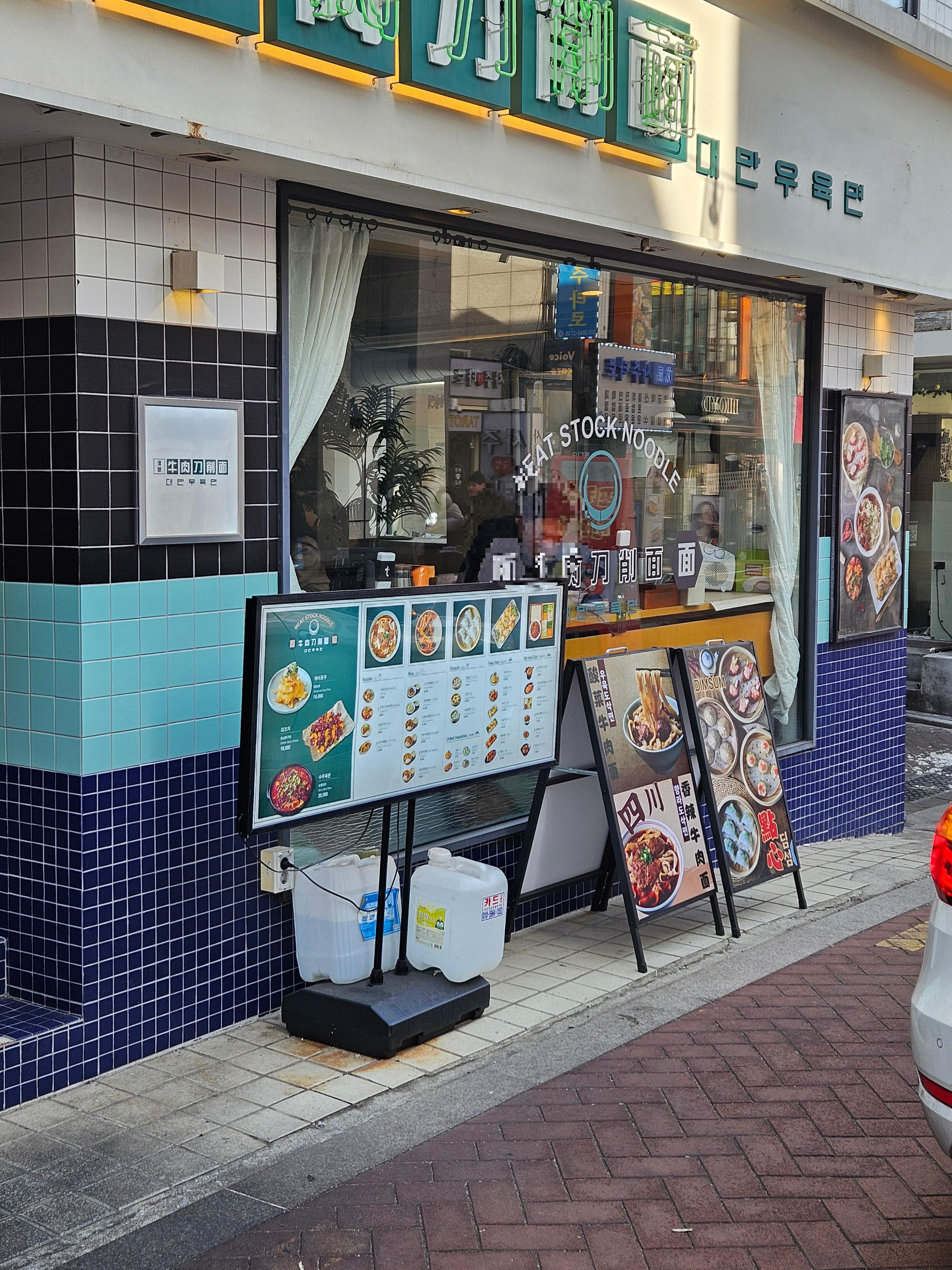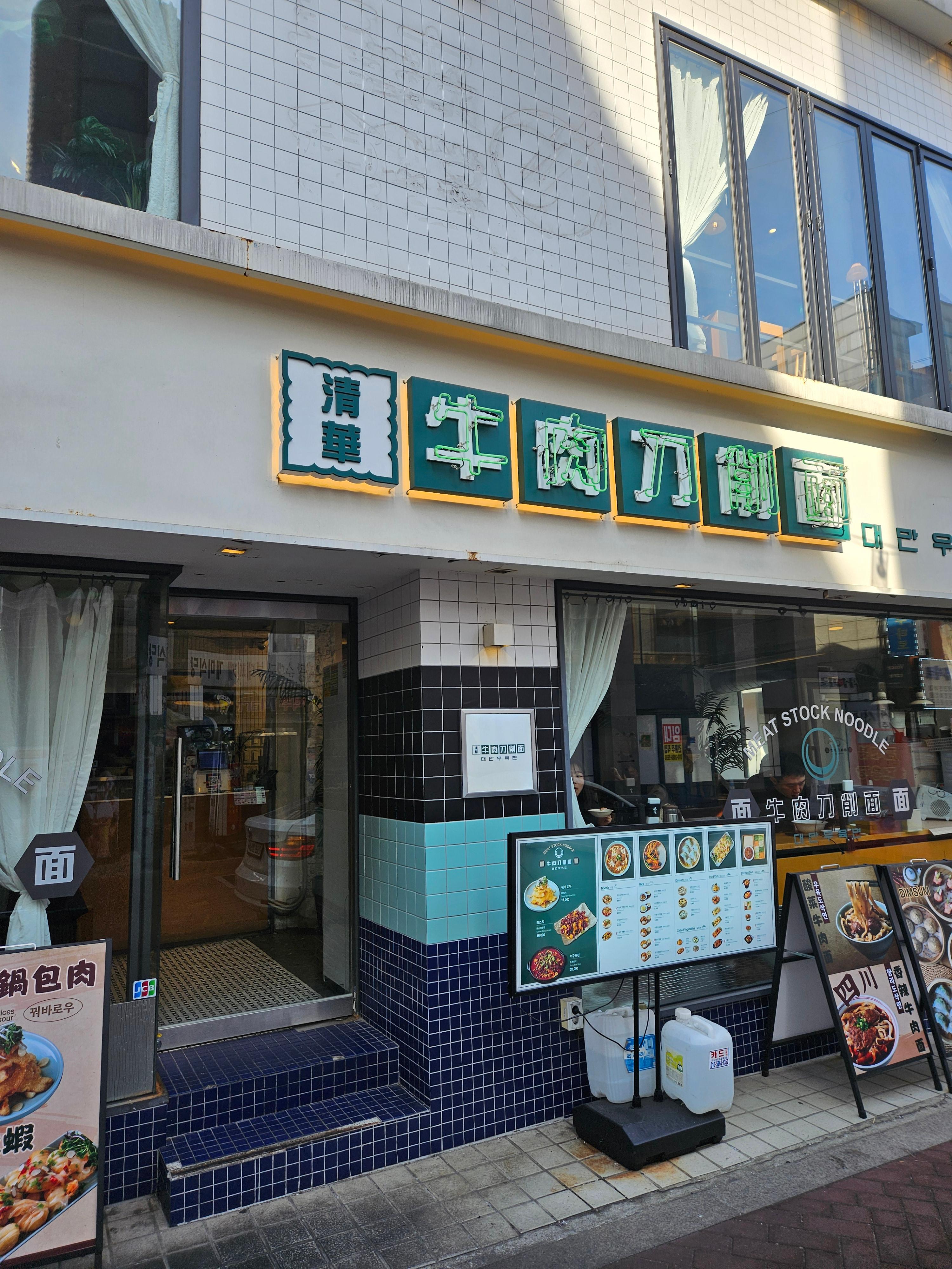 외관은 하얀색 건물에 초록색 네온 간판이 눈에 띄어요. '대만우육면'이라고 크게 써있어서 바로 알아볼 수 있답니다. 🏛️