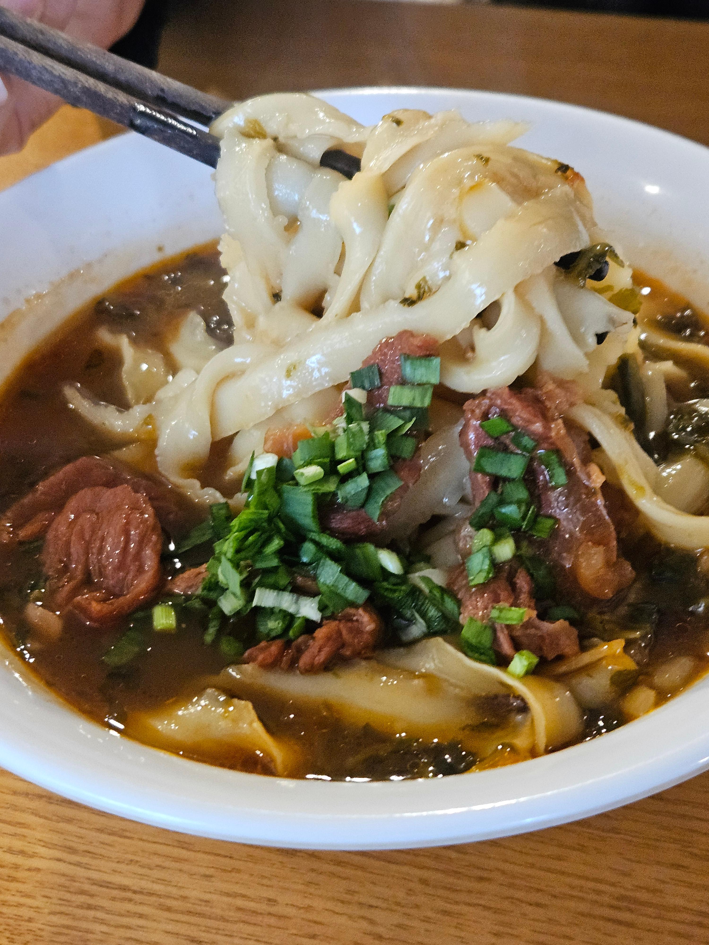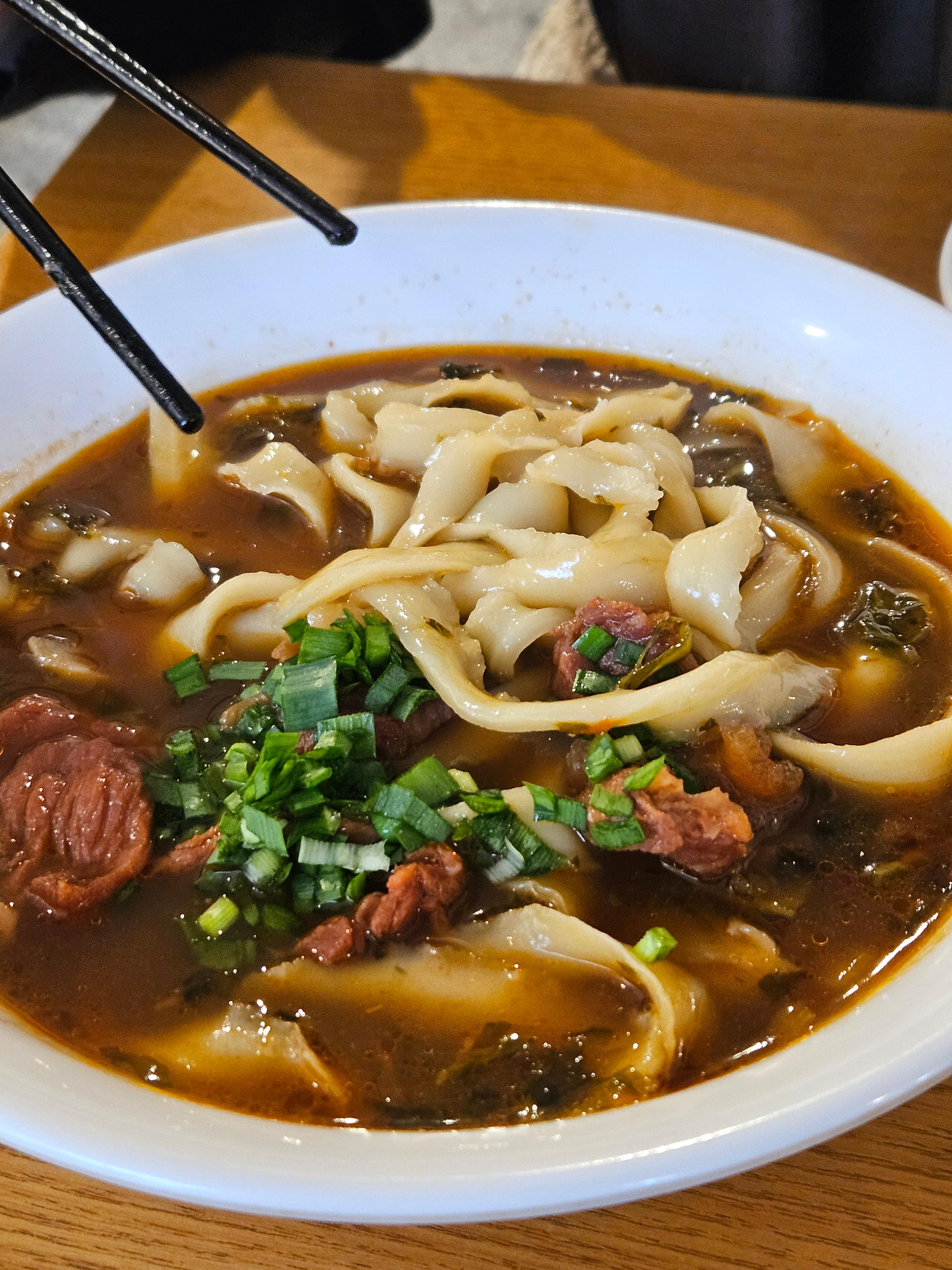 국물이 진하면서도 깔끔해요. 면은 도삭면 특유의 쫄깃함이 살아있고, 고기는 부드럽게 익어서 국물 맛을 더해줘요.