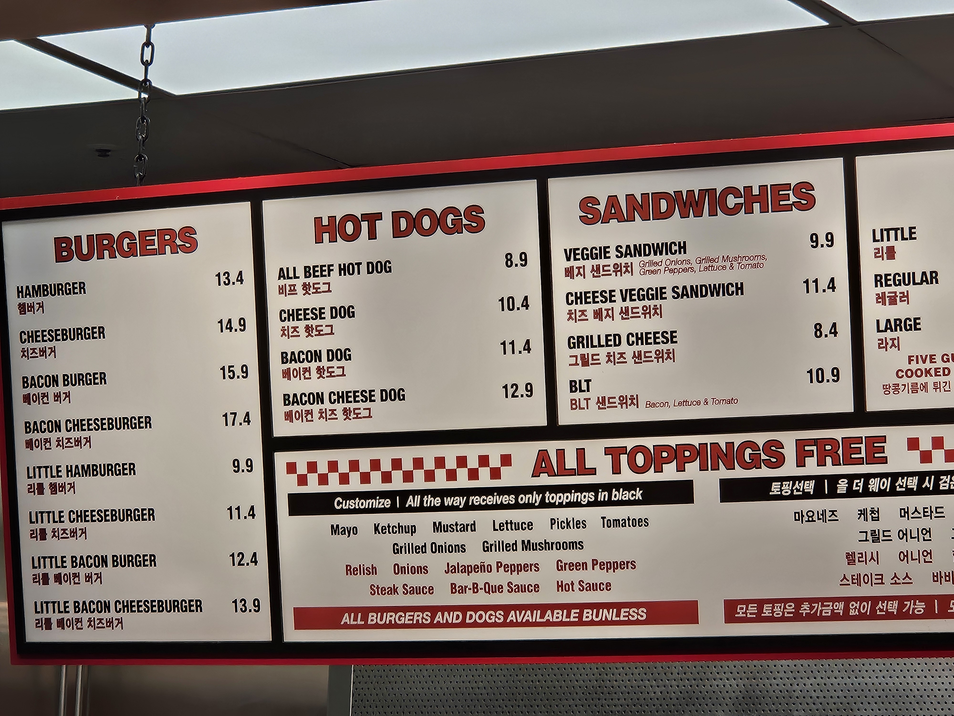 파이브가이즈의 메뉴는 정말 다양해요! 햄버거부터 핫도그, 샌드위치까지 골라먹는 재미가 있답니다.