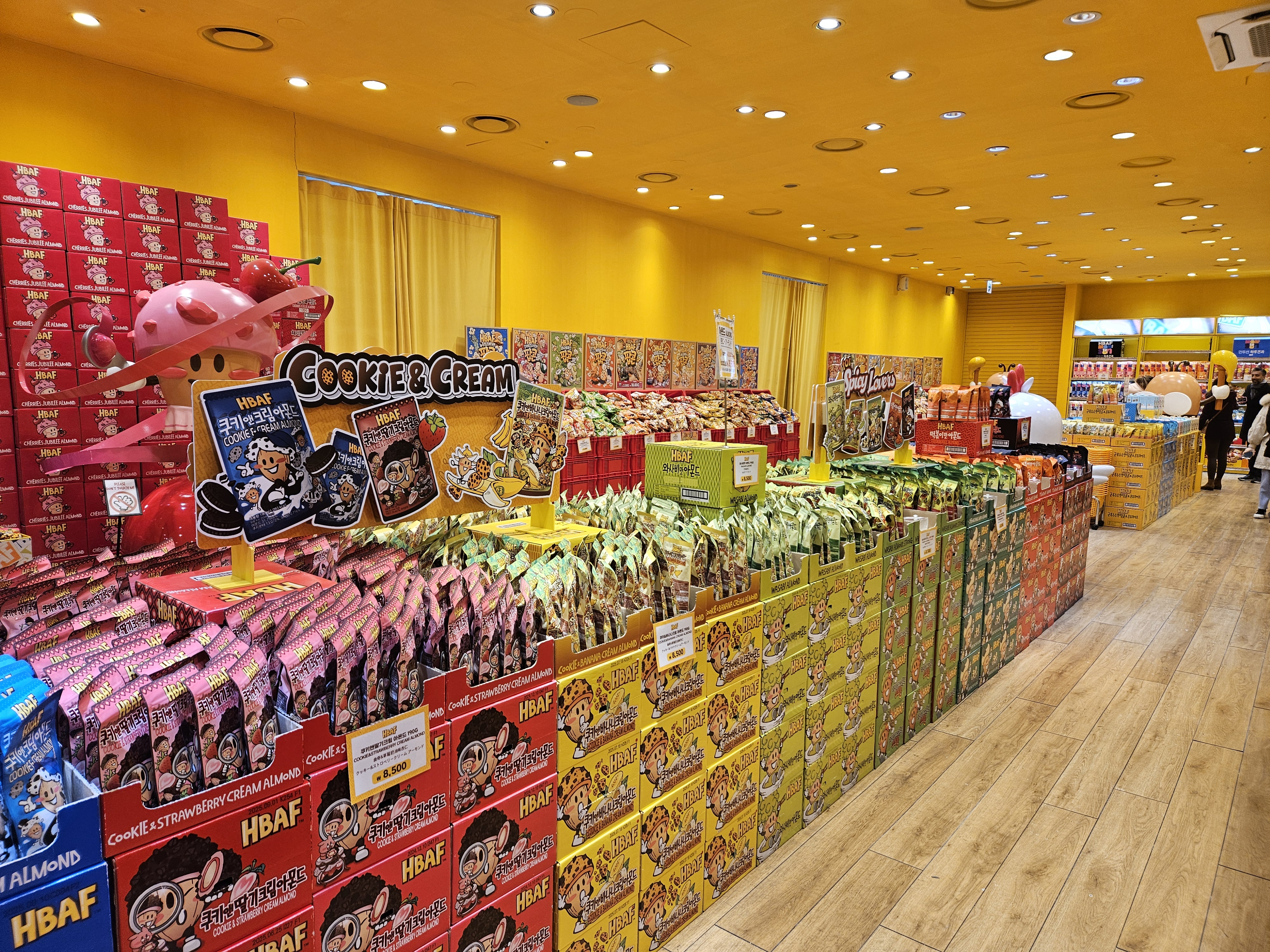 내부는 알록달록한 색감으로 꾸며져 있어서 보는 것만으로도 즐거워요. 귀여운 아몬드 캐릭터들이 곳곳에 있어 포토존으로도 딱이에요! 📸✨