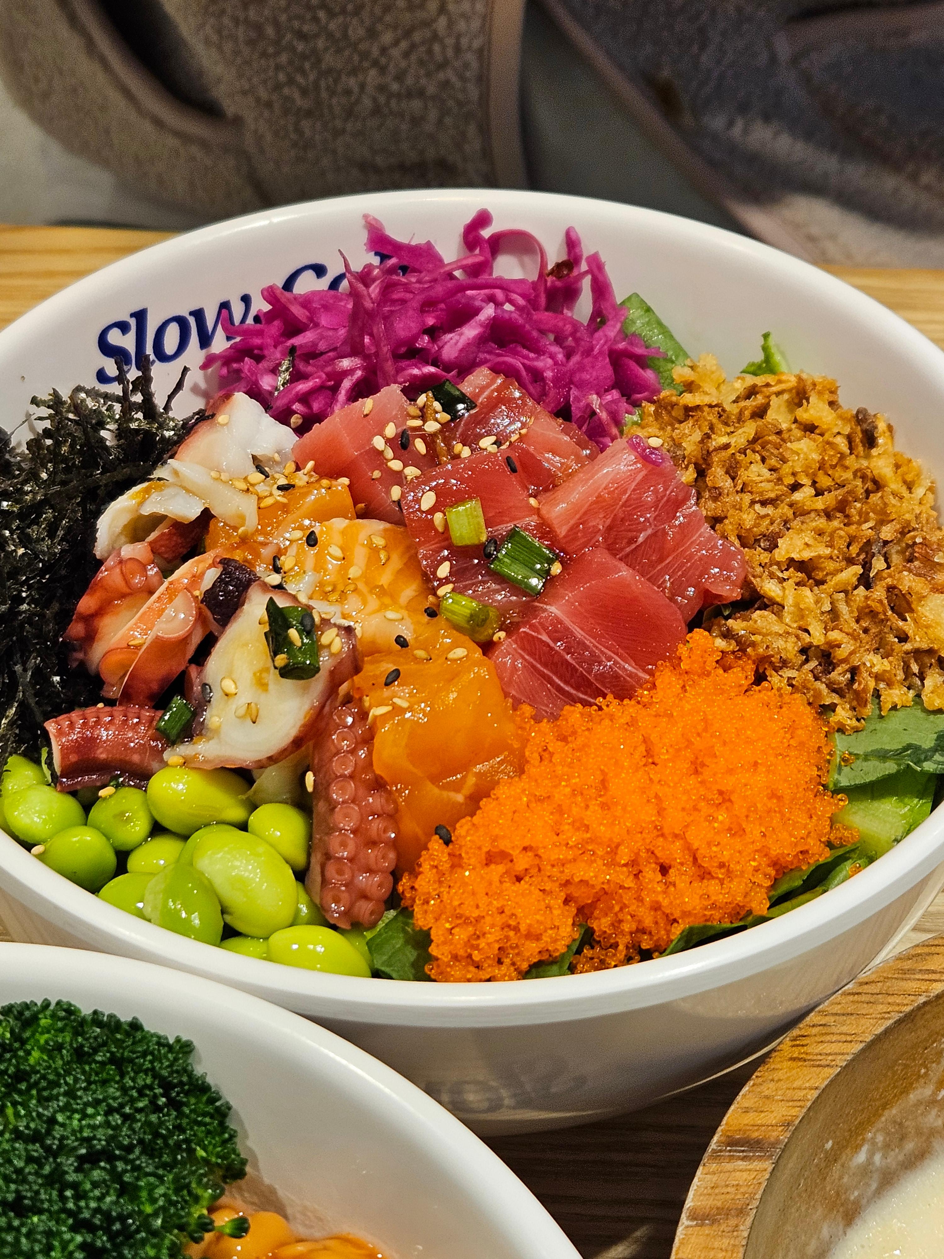 문어, 참치, 연어 등 다양한 재료가 한 그릇에 담겨 있어요. 신선한 해산물과 아삭아삭한 채소가 조화를 이루며 입안에서 풍성한 식감과 맛을 느낄 수 있었답니다. 와사비 오일을 살짝 곁들여 먹으니 풍미가 배가 되었어요! 🐟🐙