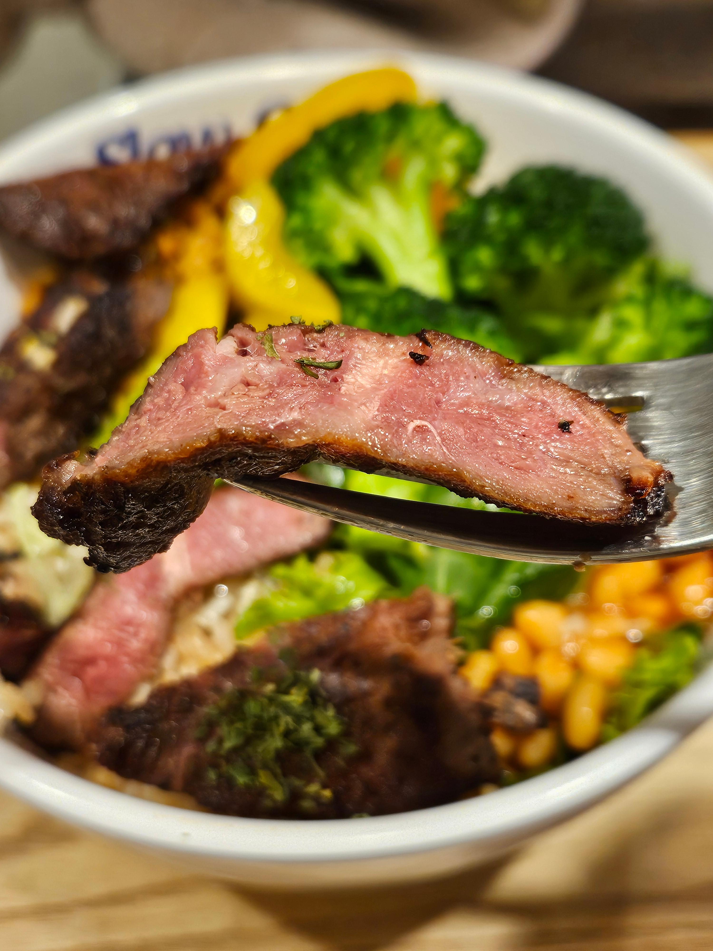 부드럽고 야들야들한 부채살 스테이크가 듬뿍 올라가 있어서 비주얼부터 합격! 브로콜리와 현미밥이 함께 곁들여져 있어 건강하게 단백질을 보충할 수 있는 메뉴였어요. 고기가 느끼하지 않아 끝까지 맛있게 먹었답니다. 🥦🍚