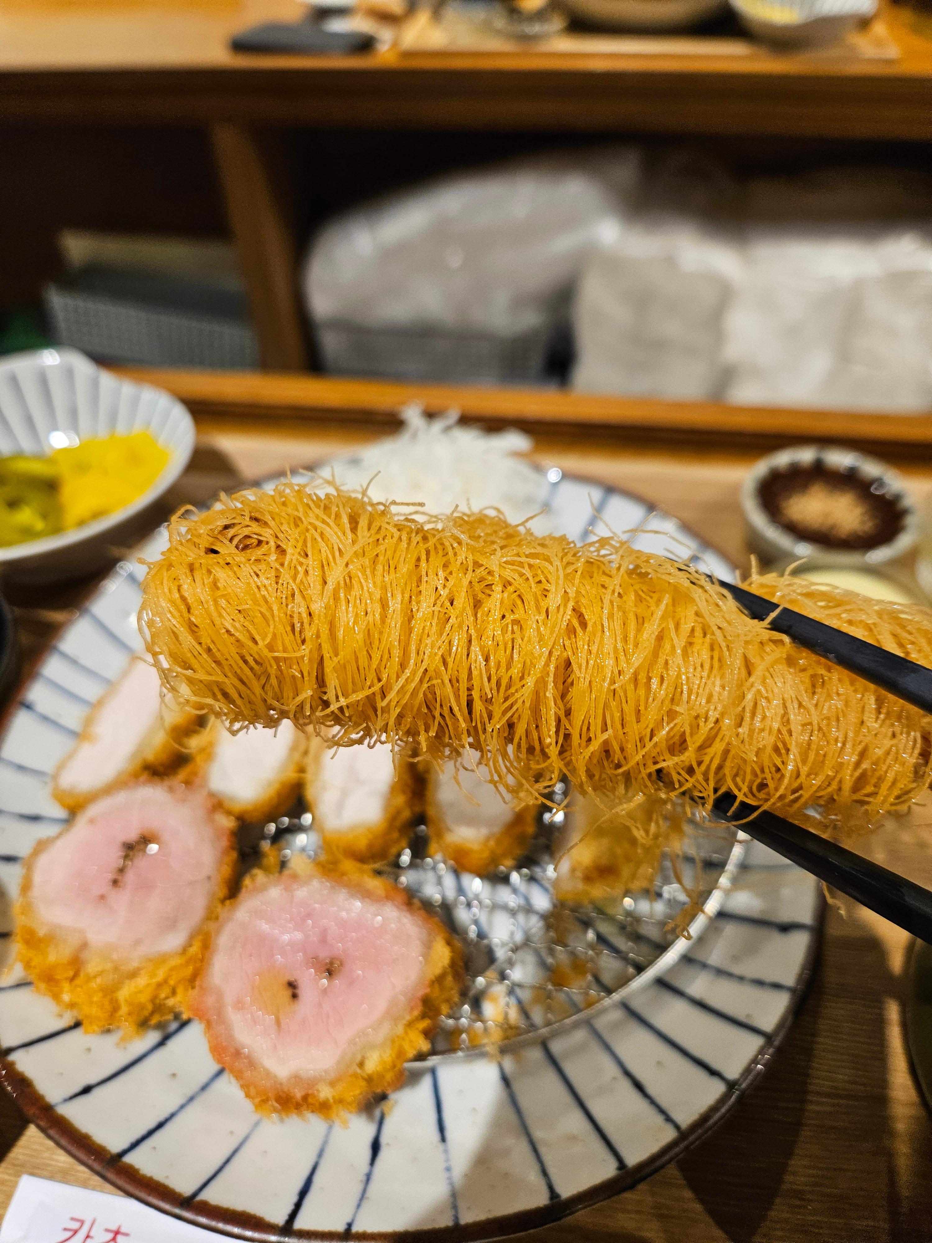 돈카츠의 두께가 정말 두툼해서 놀랐어요! 겉은 바삭하고 속은 촉촉하게 육즙이 살아있어서 한 입 베어물면 고소함이 입안 가득 퍼집니다.