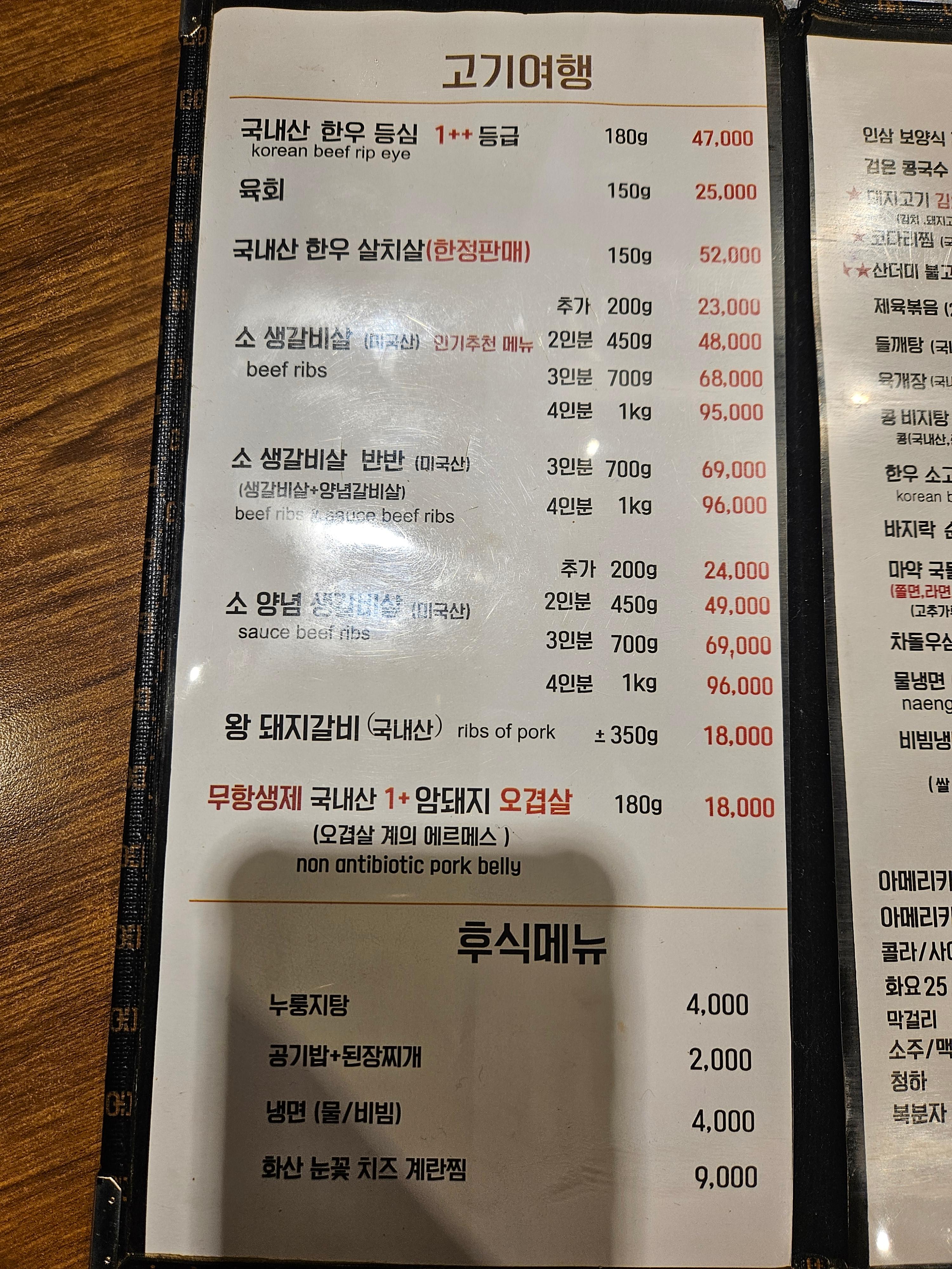 자리에 앉자마자 메뉴판부터 스캔! 🧐 고기 종류가 다양해서 뭘 먹을지 행복한 고민에 빠졌답니다. 삼겹살, 목살, 항정살 등등... 가격대도 요즘 물가 생각하면 정말 착한 편이었어요. 역시 가성비 맛집으로 소문난 이유가 있었네요! 👏